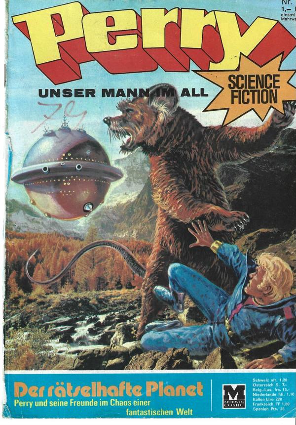 Perry unser Mann im All Nr. 7Titel: Der rätselhafte PlanetVerlag: Moewig , 1969Comic Heft 30 SeitenFormat: 18 x 26 cmZustand: gut, Gebrauchsspuren am Cover,Seiten sauber