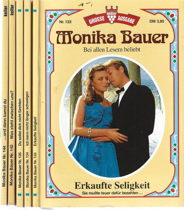 Monika Bauer Nr. 133,134,135,142,144.(5 Stück)große SchriftKelter Verlag Hamburg5 Romne á 128 SeitenFormat: 13 x 18,5 x 3 cmZustand: gut, leichte Gebrauchsspuren