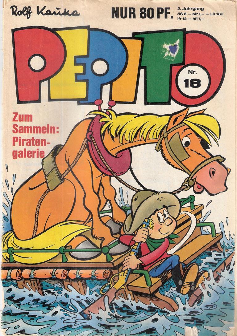 Rolf Kaukas Pepito Nr. 18Verlag: Gevacur, Zug (Schweiz)Comic Heft 31 SeitenFormat: 18 x 26 cmGewicht: 53 gZustand: deutliche Gebrauchsspuren am Cover,Seiten sauber