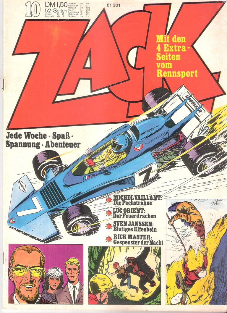 ZACK Die großen Abenteuer unserer ZeitNr. 10 / 1973Inhalt: Michel Vaillant : Die PechsträhneLuc Orient: Der FeuerdrachenSven Janssen: Blutiges ElfenbeinRick Master: Gespenster der NachtVerlag: Koralle Verlag 1973Comic Hefte 49 SeitenFormat: 21 x 28 cmGewicht: 125gZustand: gebraucht, gutComic