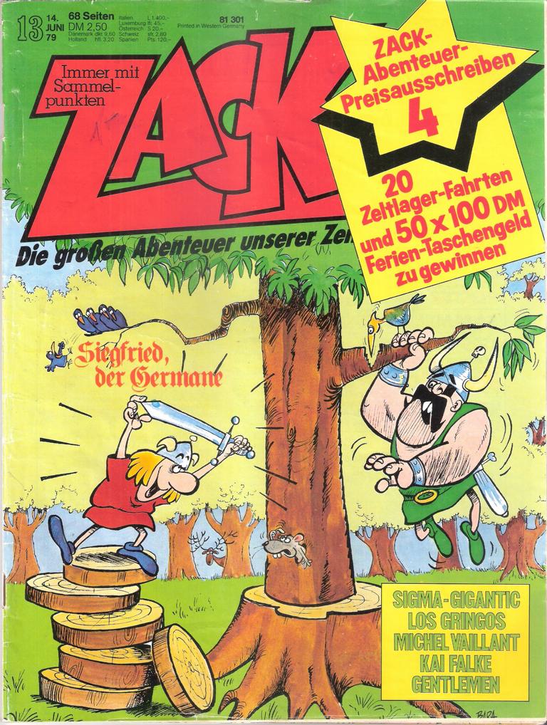 ZACK Die großen Abenteuer unserer ZeitNr. 13 / 1979Inhalt: Kai FalkeSigma-GiganticLos GringosSiegfried, der GermaneGentlemen GmbHMichel VaillantVerlag: Koralle Verlag 1979Comic Hefte 66 SeitenFormat: 21 x 28 cmGewicht: 120 gZustand: gut, leichte Gebrauchsspuren,Comic