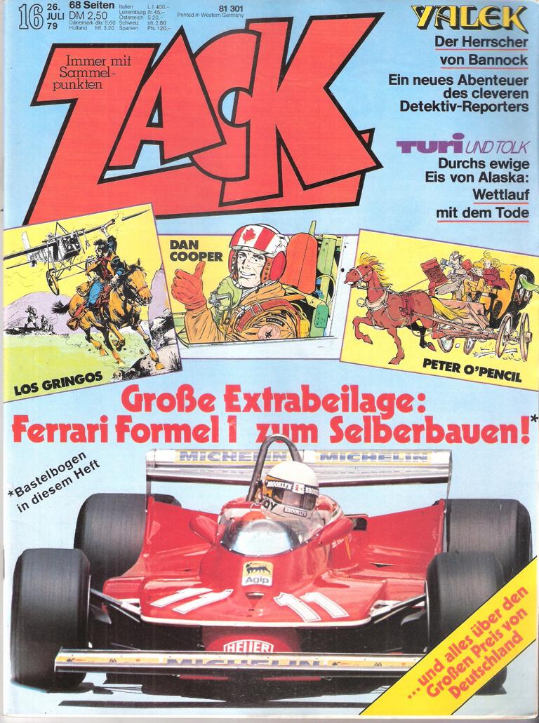 ZACK Die großen Abenteuer unserer ZeitNr. 16 / 1979Inhalt: YalekTuri & TolkLos GringosDan CooperPeter O´PencilBeilage: Ferrari Formael 1 zum SelberbauenVerlag: Koralle Verlag 1979Comic Hefte 66 SeitenFormat: 21 x 28 cmGewicht: 120 gZustand: gut Comic