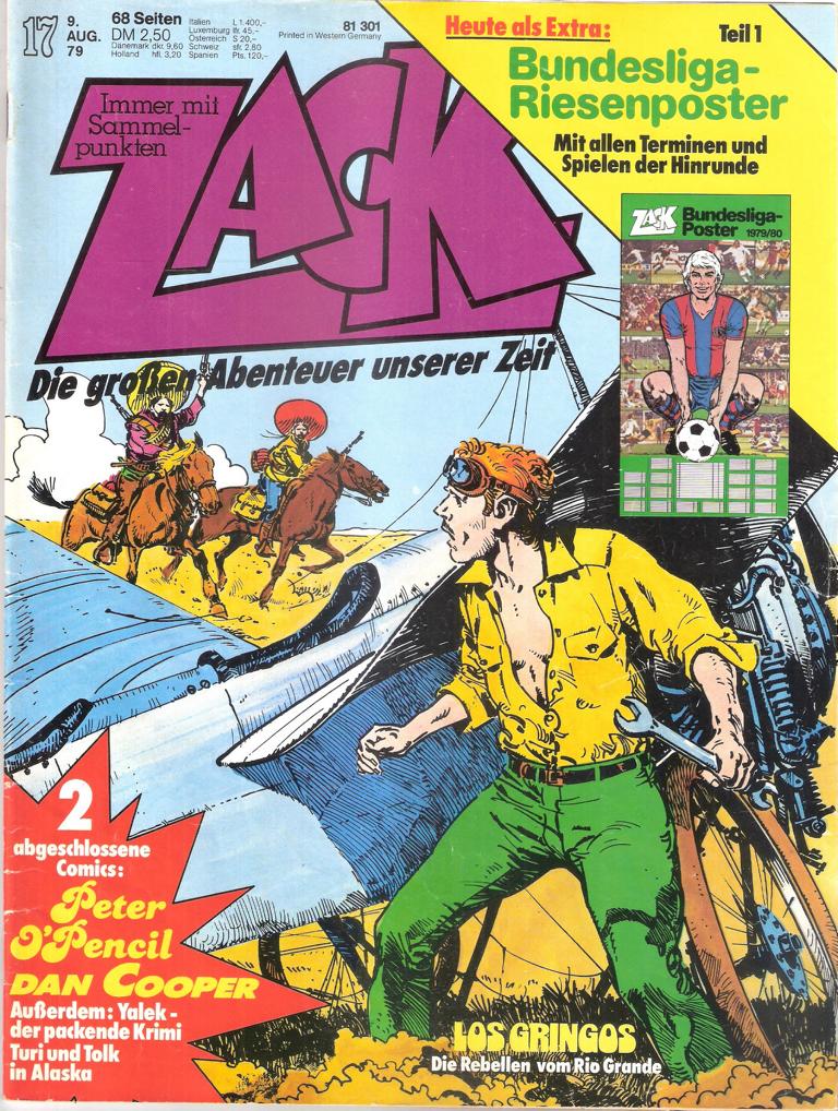 ZACK Die großen Abenteuer unserer ZeitNr. 17 / 1979Inhalt: Los GringosPeter O´PencilDan CooperYalekTuri & TolkVerlag: Koralle Verlag 1979Comic Hefte 66 SeitenFormat: 21 x 28 cmGewicht: 120 gZustand: gut, leichte Gebrauchsspuren,Sammelpunkete fehlenComic