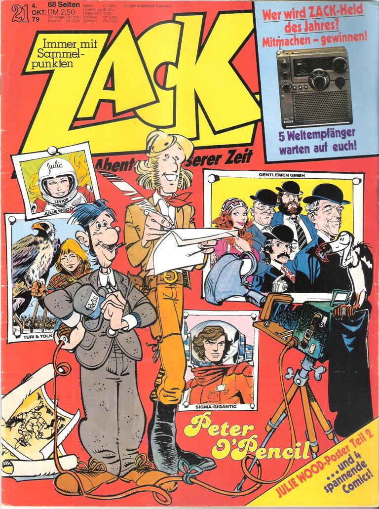 ZACK Die großen Abenteuer unserer ZeitNr. 21 / 1979Inhalt: Julie WoodSigma-GiganticPeter O´PencilGentlemen GmbHTuri & TolkVerlag: Koralle Verlag 1979Comic Hefte 66 SeitenFormat: 21 x 28 cmGewicht: 120 gZustand: gut, leichte Gebrauchsspuren,Sammelpunkete fehlenComic