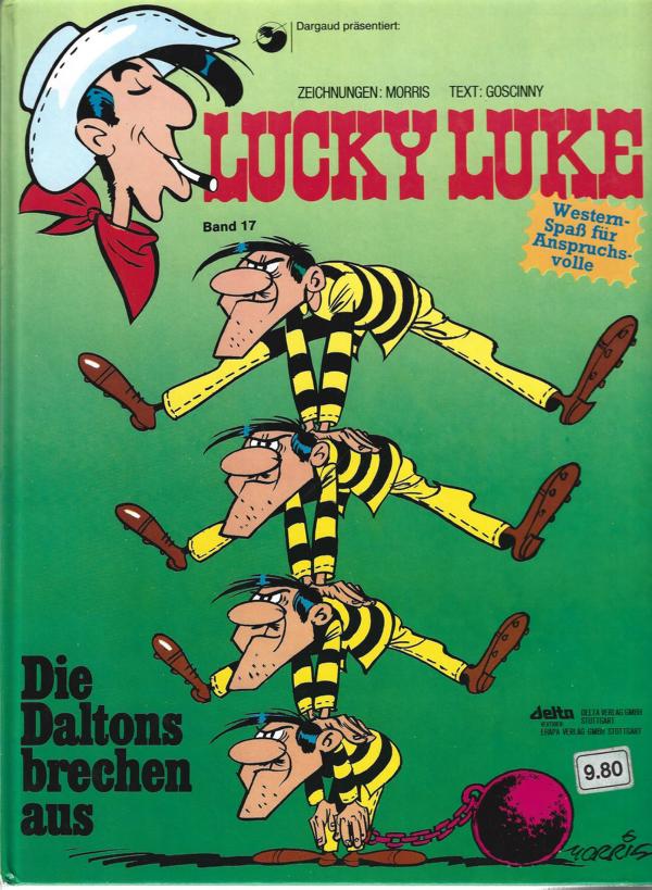Lucky Luke Band 17von: Morris + GoscinnyTitel: Die Daltons brechen aus.Verlag: Delta Verlag Stuttgart 1978Comic Hardcover 46 SeitenFormat: 21,5 x 28,5 cmZustand: sehr gut