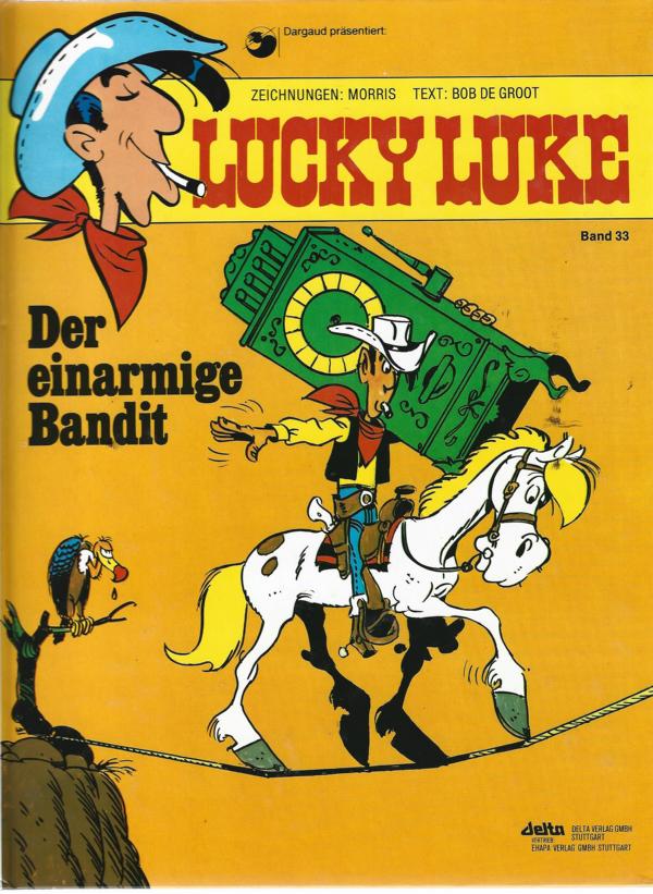 Lucky Luke Band 33von: Morris + GoscinnyTitel: Der einarmige Bandit.Verlag: Delta Verlag Stuttgart 1982Comic Hardcover 46 SeitenFormat: 21,5 x 28,5 cmZustand: sehr gut