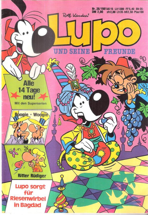 Rolf Kauka´s Lupo und seine Freunde Nr. 26/1981Verlag: Erich Pabel, Rastatt 1981Comicheft 42 SeitenFormat: 18 x 26 cmGewicht: 75 gZustand: sehr gut,