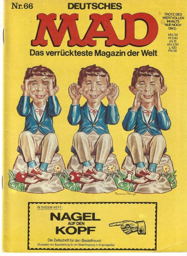 Comic - MAD Nr. 66 Das vernünftigste Magazin der WeltTitel: Nagel auf den Kopf.Herausgeber: Klaus RechtRedaktion: Herbert FeuersteinVerlag: Williams Verlag GmbH HamburgComic Heft Format: 20,5 x 27 cmZustand: gut, Papier altersbedingt leicht nachgedunkelt