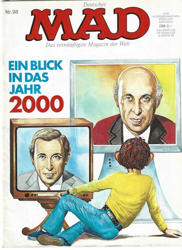 Comic - MAD Nr. 98 Das vernünftigste Magazin der WeltTitel: Ein Blick in das Jahr 2000.Herausgeber: Klaus RechtRedaktion: Herbert FeuersteinVerlag: Williams Verlag GmbH HamburgComic Heft Format: 20,5 x 27 cmZustand: gut, Papier altersbedingt leicht nachgedunkelt