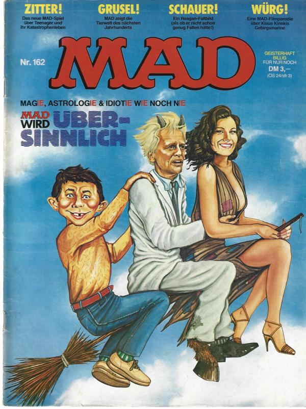 MAD Nr. 162Das vernünftigste Magazin der WeltTitel: MAD wird Übersinnlich.Herausgeber: Klaus RechtRedaktion: Herbert FeuersteinVerlag: Williams Verlag GmbH HamburgComic Heft Format: 20,5 x 27 cmZustand: gut, Papier leicht nachgedunkelt,