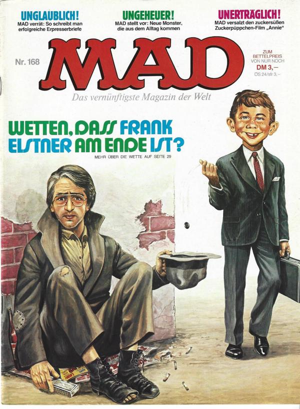 Comic - MAD Nr. 168Das vernünftigste Magazin der WeltTitel: Wetten, dass Frank Elstner am Ende ist?Verlag: Williams Verlag GmbH HamburgMagazin 33 SeitenFormat: 20 cm x 27 cmZustand: sehr gut, Papier altersbedingt nachgedunkelt