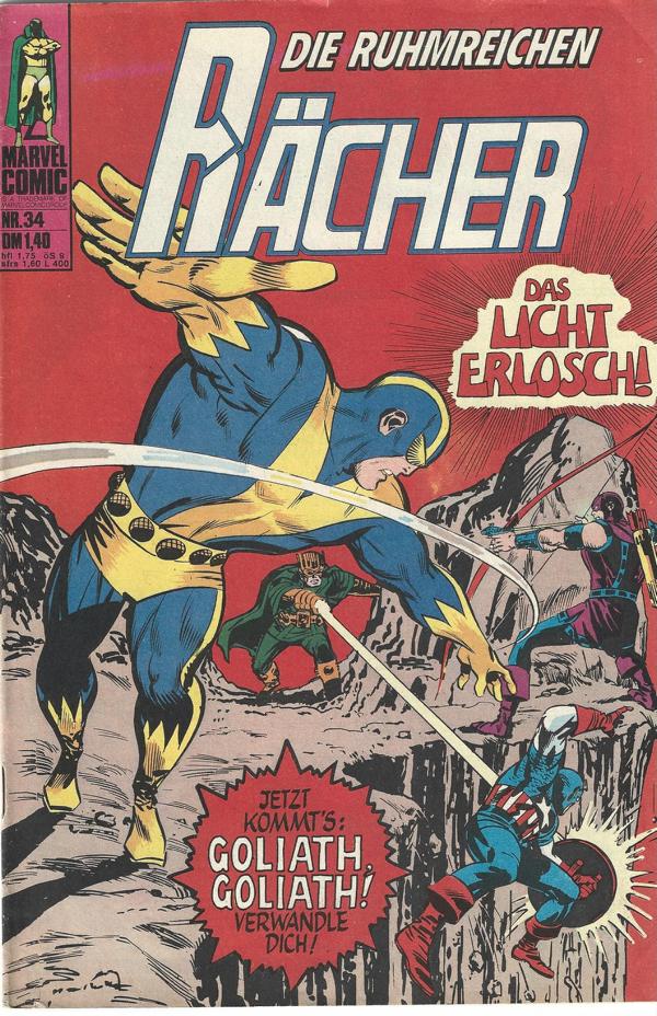 Marvel ComicDie ruhmreichen Rächer Nr. 34Titel: Das Licht erlosch! Verlag: Williams Verlag Hamburg 1976Comic-Heft 30 SeitenFormat: 17 x 24,5 cmZustand: sehr gut