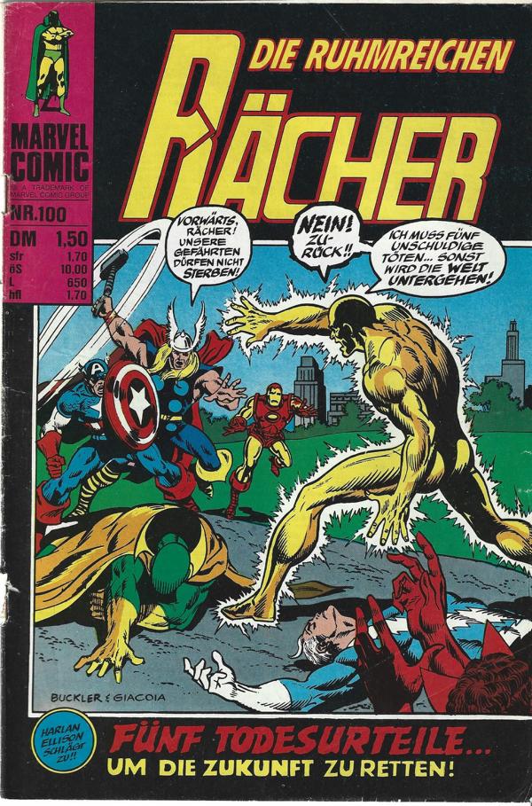 Marvel-Comic Nr. 100 - Die ruhmreichen RächerVerlag: Williams Verlag Hamburg (c) 1976Comic Heft 29 SeitenFormat: 17 x 24,5 cmZustand: leichte Gebrauchsspuren,Titelblatt beschädigt, eingerissen, Seiten sauber