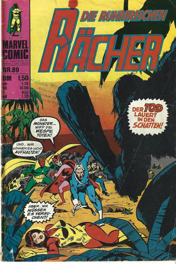 Marvel-Comic Nr. 89 - Die ruhmreichen RächerVerlag: Williams Verlag Hamburg (c) 1976Comic Heft 29 SeitenFormat: 17 x 24,5 cmZustand: deutliche Gebrauchsspuren,Titelseite Rücken und Seite 31/32 mit Tesa geklebtSeite 3 gestempelt