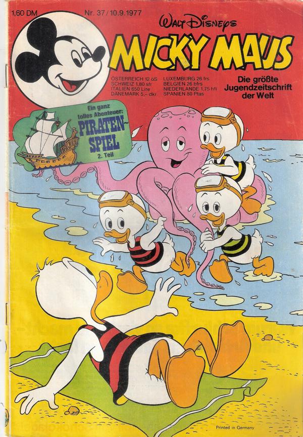 Walt Disneys Micky Maus Heft Nr. 37/1977mit Beilagen Ehapa Verlag 1977Comic Heft, 43 SeitenFormat: 17,5 x 26 cmGewicht: 65 gZustand: mit leichteren Gebrauchsspuren