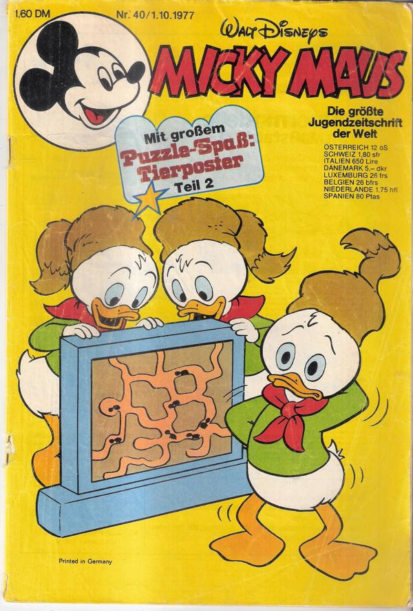 Walt Disneys Micky Maus Heft Nr. 40/1977mit Beilagen Ehapa Verlag 1977Comic Heft, 43 SeitenFormat: 17,5 x 26 cmGewicht: 72 gZustand: mit leichteren Gebrauchsspuren