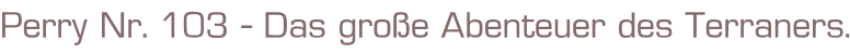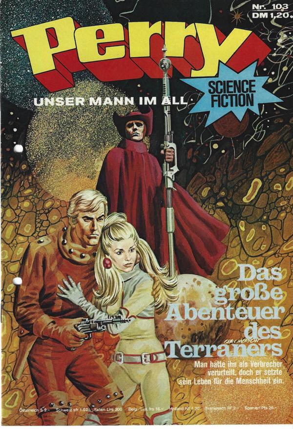 Perry unser Mann im All Nr.103Titel: Das große Abenteuer des Terraners.Verlag: Moewig , 1974Comic Heft 30 SeitenFormat: 18 x 26 cmZustand: gelocht, sehr gut