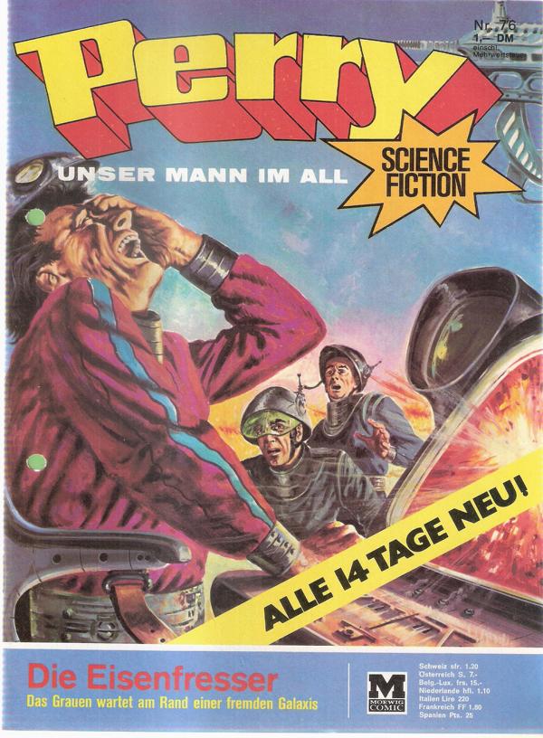 Perry unser Mann im All Nr.76Titel: Die EisenfresserVerlag: Moewig , 1973Comic Heft 30 SeitenFormat: 17,5 x 24 cmGewicht: 52 gZustand: gelocht, sehr gut