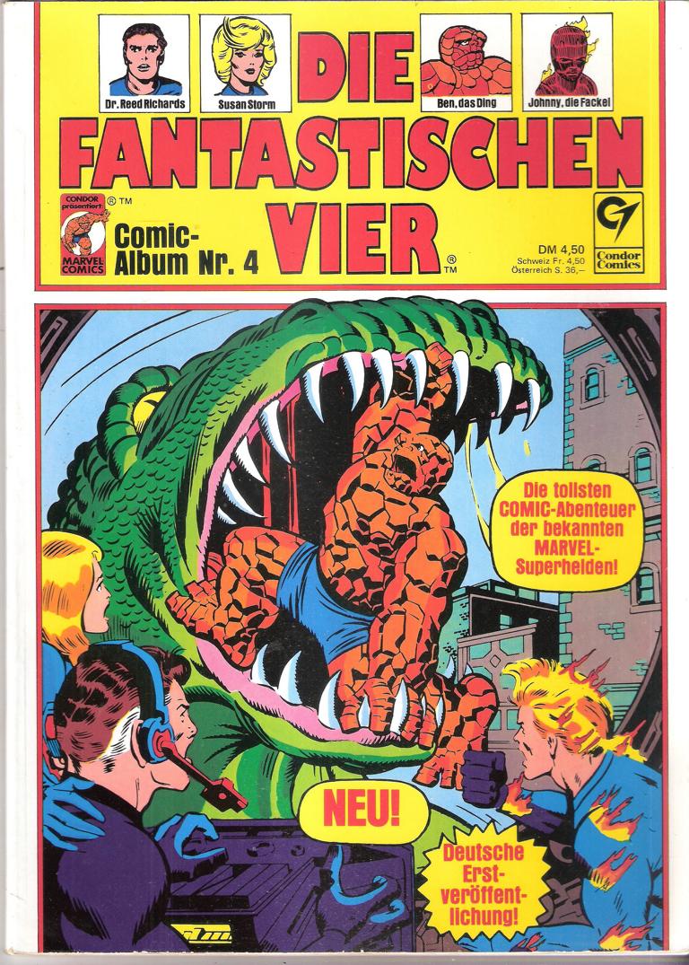 Titel: Die fantastischen VierComic Album Nr. 4Verlag: Condor Verlag GmbH & Co. Frankfurt (c) 1975Softcover ComicFormat: 21 x 29 x 0,5 cmGewicht: 191 gZustand: gut, leichte Stand- bzw GebrauchsspurenComic