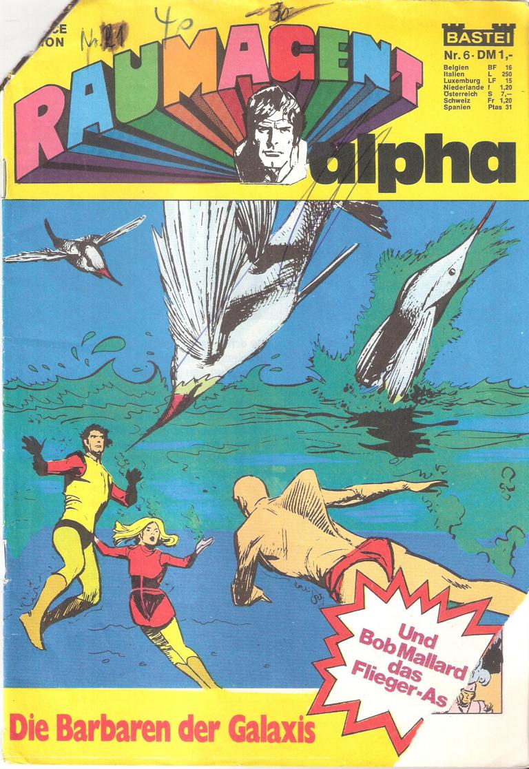 Raumagent alpha Nr. 6Science FictionTitel: Die Barbare der GalaxisVerlag: Bastei Comic-Heft 38 SeitenFormat: 18 x 26 cmGewicht: 73 gZustand: Cover beschädigt, Ecke oben links abgeschnitten, sonst gut