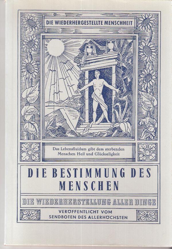 Titel: Die Bestimmung des Menschen - Das Lebensfluidum gibt den sterbenden Menschen Heil und Glückseligkeit Die wiederhergestellte Menschheit - Die Wiederherstellung aller Dinge Veröffentlicht vom Sendboten des Allerhöchsten