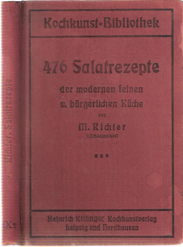 Kochkunst Bibliothek - 476 Salatrezepteder modernen feinen und bürgerlichen Küchenach den besten Quellen zusammengestelltvon M. Richter KüchenmeisterVerlag: Heinrich Killinger - Kochkunstverlag 3. wiederum erweiterte Auflage 1914Geb. Buch 0, 141 SeitenFormat: 13 x 19 x 1,5 cmGewicht: 286 gZustand: Buchschnitt angestaubt, gut erhaltenes ExemplarSammlerstückKochen