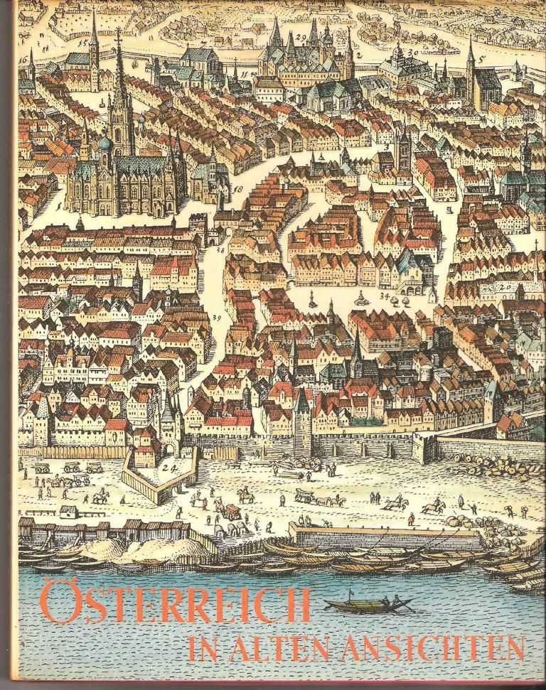 Ein Bildband mit Ansichten Österreichs aus Matthäus Merians und G. M. Vischers Topographien, G. Braun und F. Hogenbergs "Civitates Orbis Terrarum", H.Scheidels Weltchronik u. a.
