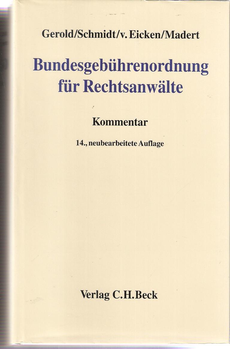 Bundesgebührenordnung für Rechtsanwälte / BragoKommentar - Gerold/Schmidt/v.Eicken/MadertISBN 3406449948Verlag: C.H.Beck 14. neubearbeitete Auflage 1999Dünndruck Ausgabe 1, 1.560 SeitenFormat: 14,5 cm x 23 cm x 5,5 cmGewicht: 1.390 gZustand: sehr gut noch im Katonierten Schuber