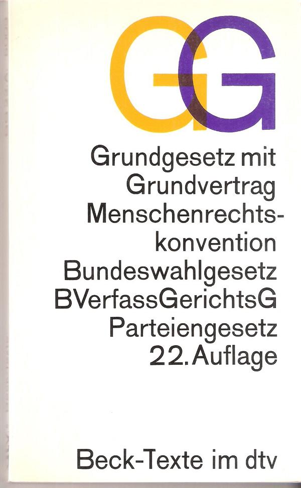 Titel: Grundgesetz mit Grundvertrag Menschenrechtskonvention Bundeswahlgesetz BVerfass GerichtsG Parteiengesetz ISBN 3423050039Verlag: dtv 22. Auflage 1986Taschenbuch, 211 SeitenFormat: 11 cm x 18 cm x 1 cmGewicht: 143 gZustand: gut Recht Gesetzbuch