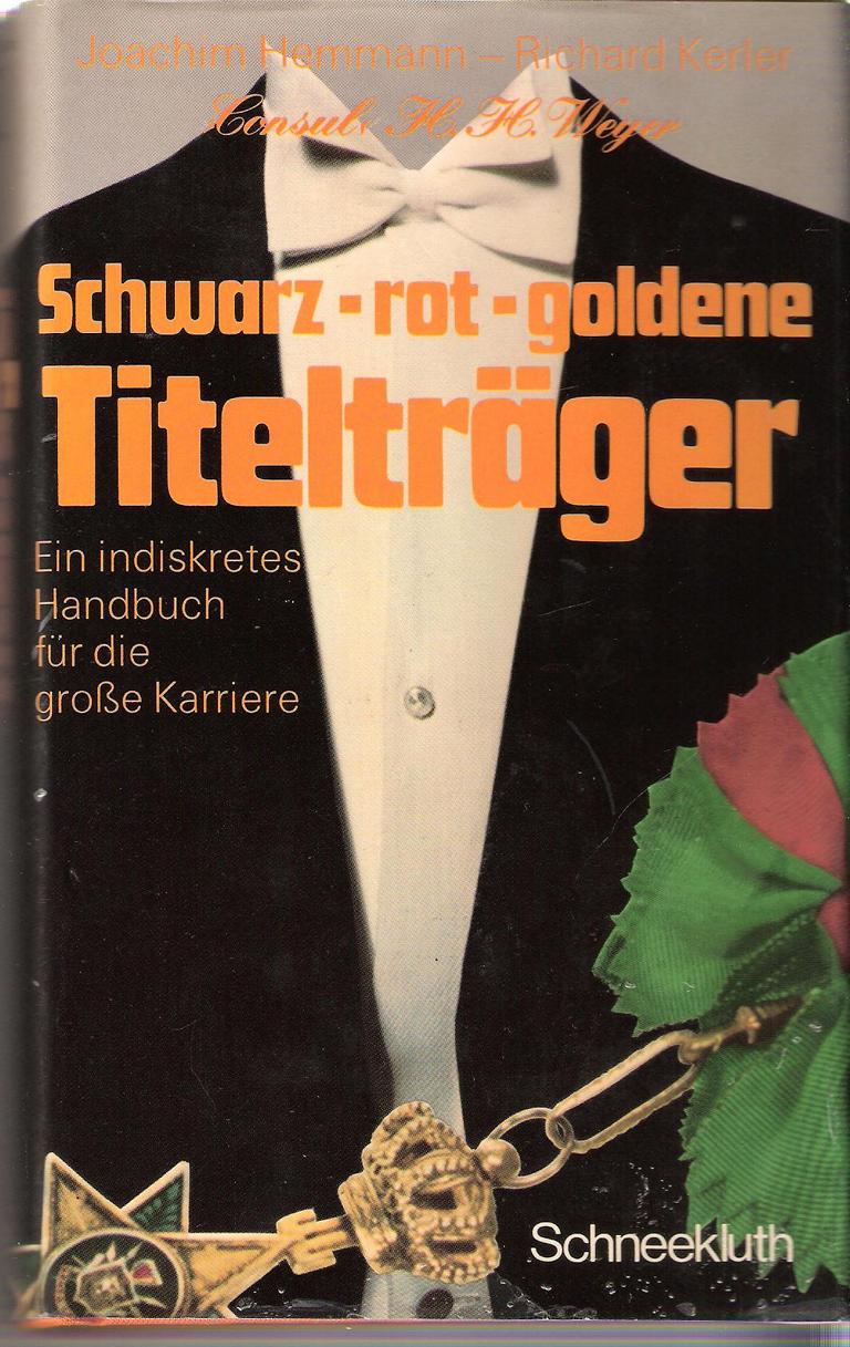 Schwarz-rot-goldene TitelträgerEin indiskretes Handbuch für die große Karriere. ISBN 3795102146Autor: Joachim Hemmann – Richard Kerler-Consul H.H.WeyerVerlag: Schnekluth 1971Buch gebunden 1, 312 SeitenFormat: 13x21x2,5 cmGewicht: 480 gZustand: Gut, Schutzhülle eingerissenManagement & Wirtschaft