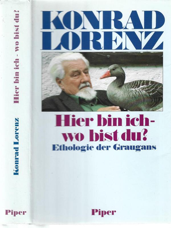 Hier bin ich - wo bist du?Ethologie der Graugans.Autor: Konrad LorenzISBN 349203246xVerlag: Piper München, 1988 Leinenausgabe mit Schutzhülle, 320 SeitenFormat: 15 x 23 x 3 cmZustand: Schutzhülle mit kleineren Einrissen,Buch selbst, sehr guter Zustand.