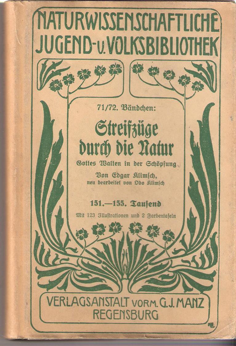 Naturwissenschaftliche Jugend- und Volksbibliothek71/72. Bändchen : Streifzüge durch die Natur - Gottes Walten in der SchöpfungAutor: Edgar KlimschVerlag: Verlagsanstalt vorm. G. J. Manz Regensburg 1929Gebundene Ausgabe 344 SeitenFormat: 13 cm x 19,5 cm x 2 cmGewicht: 480 gZustand: Schutzhülle eingerissen, Buch selbst, sehr gut erhaltenes ExemplarNaturführer - Naturwissenschaft -