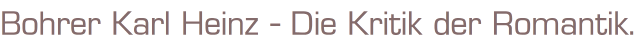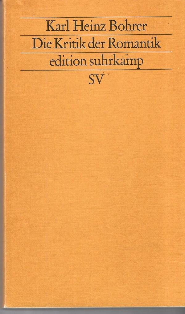 Die Kritik der Romantik.von: Karl Heinz BohrerISBN 9783518115510Verlag: Suhrkamp, Frankfurt am Main 1989Taschenbuch 311 SeitenFormat: 11 x 17,7 x 1,8cmZustand: sehr gut