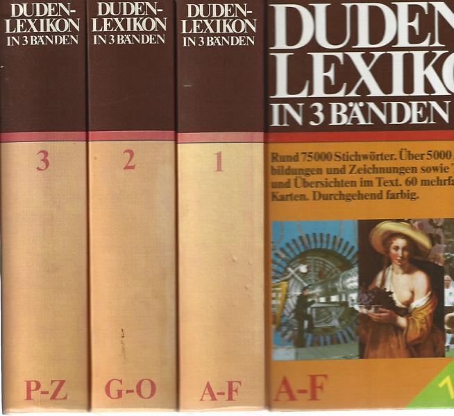 Duden - Lexikon in 3 BändenVerlag: Bibliographisches Institut Manheim7. Auflage Dudenverlag 1983ISBN 3411019794Drei Bücher 2016 SeitenFormat: 13 x 19,5 x 12 cmZustand: gut, leichte Standspuren(angestaubt)