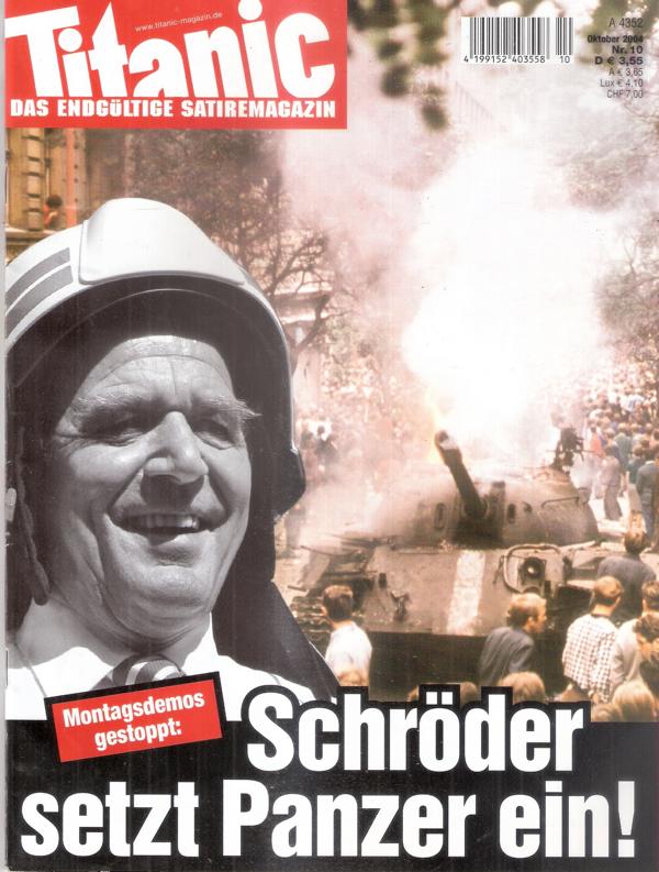 Titanic Nr. 10/ 2004Titel: Schröder setzt Panzer ein!Zeitschrift, 66 SeitenFormat: 21 x 28Gewicht: 143 gZustand: leichte Gebrauchsspuren Zeitschrift -