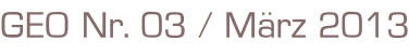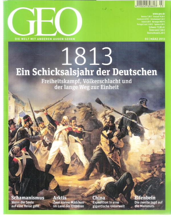 GEO Nr. 03 / März 2013Die Welt mit anderen Augen sehen Titel: 1813 Ein Schicksalsjahr der DeutschenFreiheitskampf, Völkerschlacht und derlangfe Weg zur Einheit.- Schamanismus- Arktis- China- ElfenbeinMagazin 154 SeitenFormat: 21 cm x 27 cmZustand: sehr gut