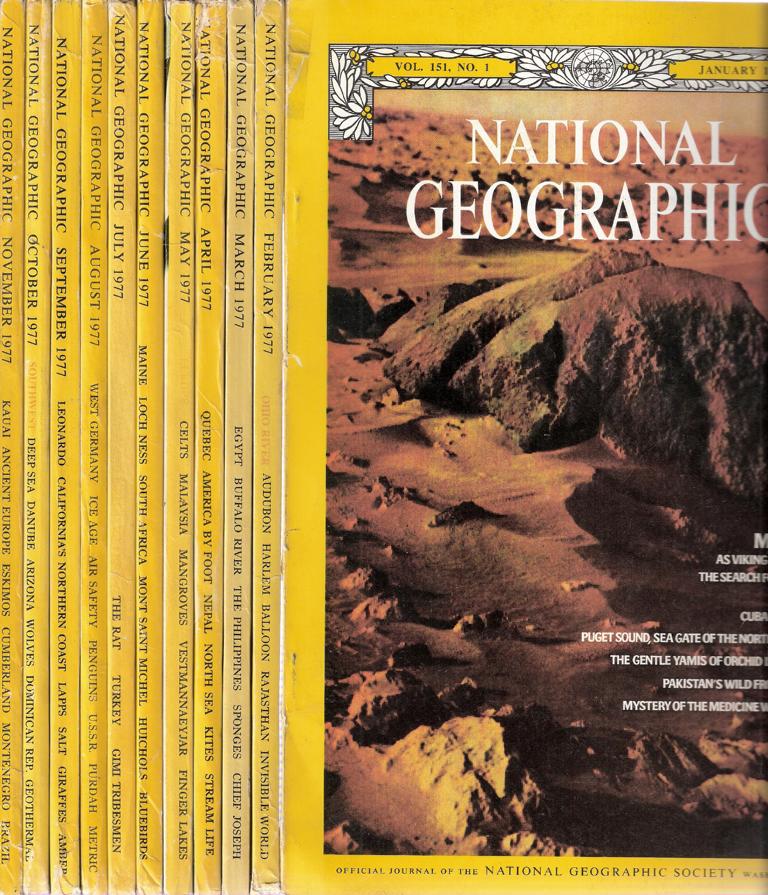 National Geographic Jahrgang 197712 Hefte Januar 1977 - Dezember 1977Sprache: EnglischFormat je Heft: 17,5 x 25,5 x 0,7 cmGewicht zusammen: 4.200 gZustand: jeweils leichte Lagerspuren am Cover,innen jeweils sehr guter Zustand