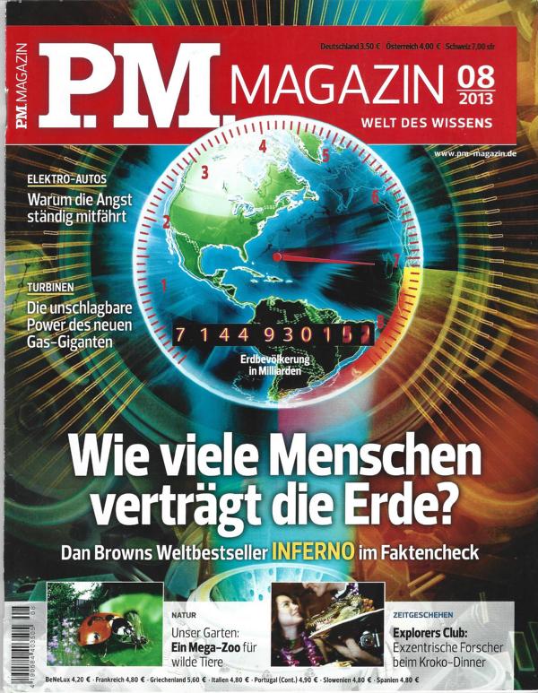 Peter Moosleitners Magazin P.M. Welt des Wissens 8/2013Titel: Wieviel Mensch verträgt die Erde?Format: 22,5 x 28 cmZustand: gut