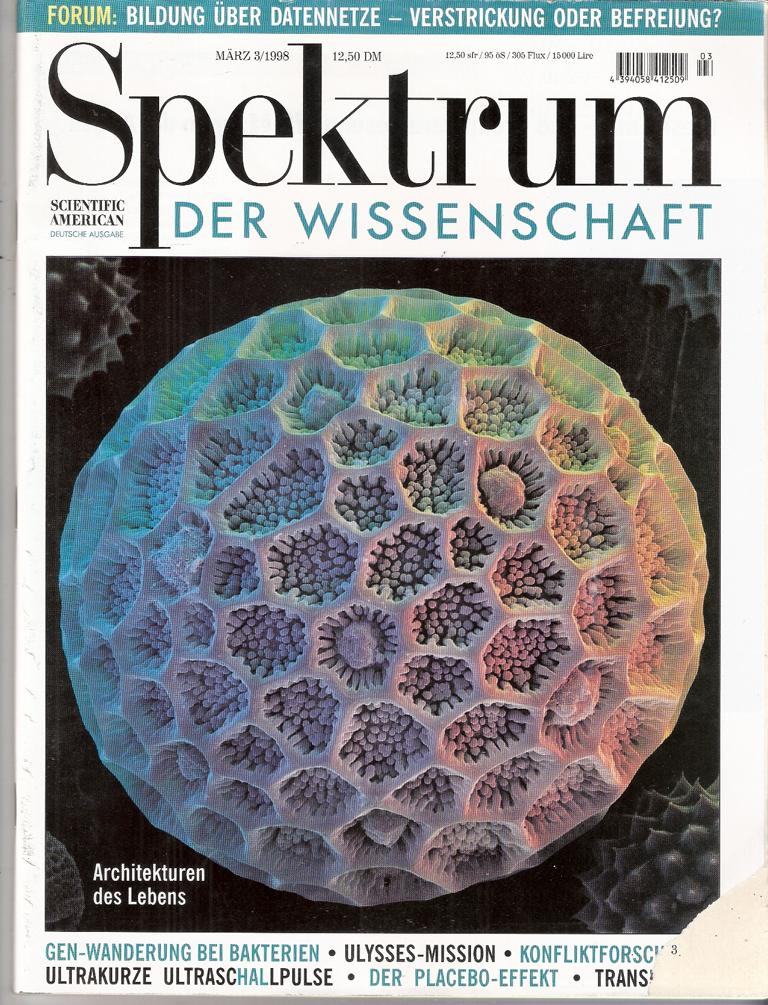 Spektrum der Wissenschaft 3/1998mit CDDeutsche Ausgabe von Scientific AmericanTitel: Architekturen des lebens- Gen-Wanderung bei Bakterien- Ulysses-Mission- Konfliktforschung- Ultrakurze Ultraschallpulse- Der Placebo EffektMagazin 114 SeitenFormat: 21 cm x 28 cmGewicht: 298 gZustand: gut, am Cover vorne fehlt eine Ecke