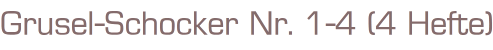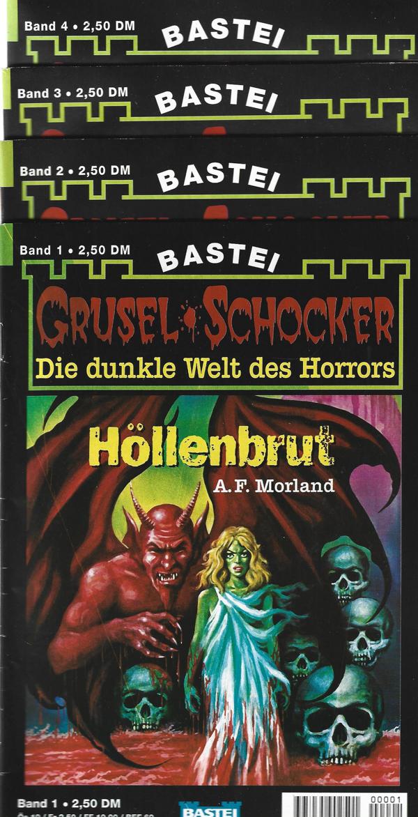 Grusel-Schocker Nr. 1-4 (4 Hefte)Nr.1) Höllenbrut von A. F. MorlandNr.2) Der Wolfsmensch von Frank deLorcaNr.3) Yeti - Killer aus dem Eis von Brian FordNr.4) Blut für den Vampir von A. F. MorlandBastei Verlag4 Romanhefte á 65 SeitenFormat: 15,5 x 22 cm x 4 StückZustand: sehr gut