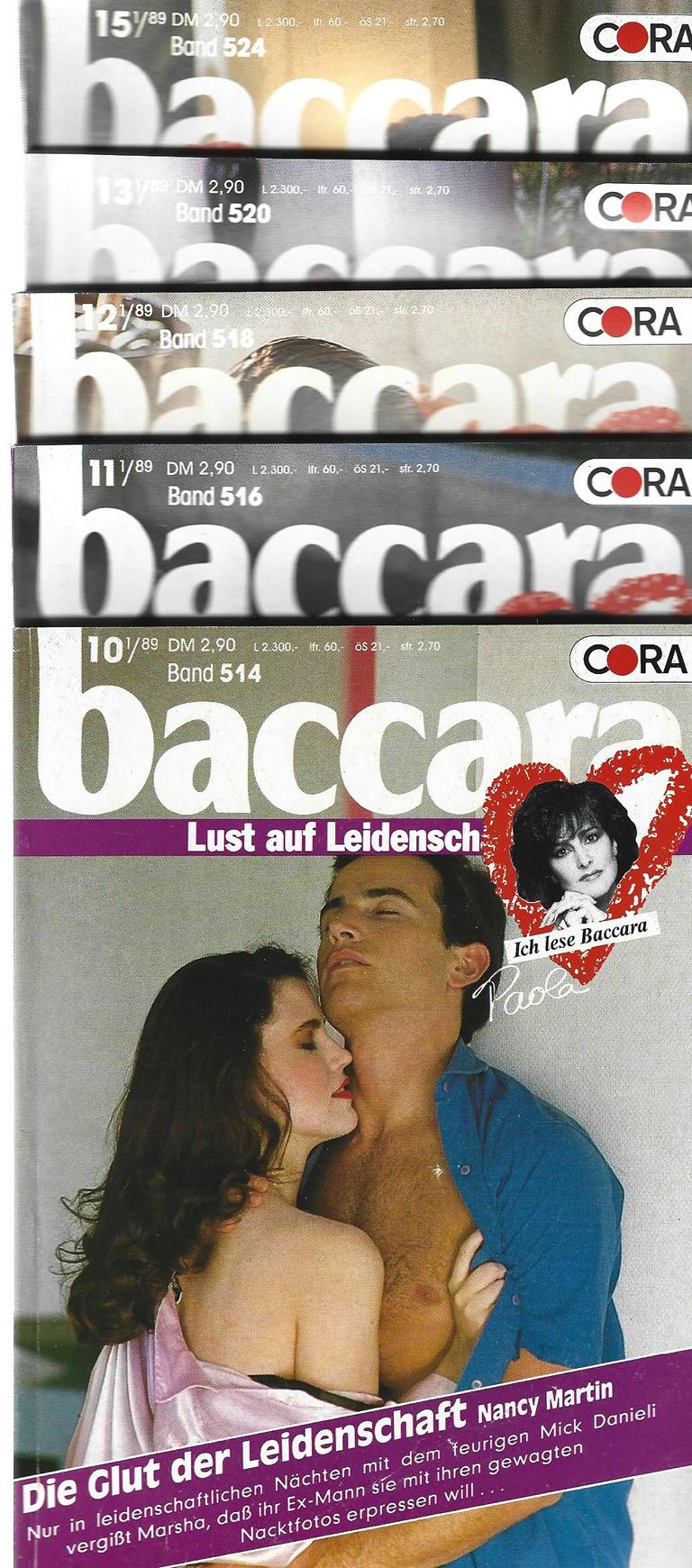 Baccara-Romanhefte 5 Stück- Lust auf LeidenschaftStück 5 Romanhefte von 1989Nr. 514) Die Glut der LeidenschaftNr. 516) Du erregst mich wie sonst keinerNr. 518) Wenn die Leidenschaft siegtNr. 520) Verführe und verwöhne michNr. 524) Juwelen der LeidenschaftCora Verlag Heft, Format: 13 x 18 x 3,5 cm Zustand: gut