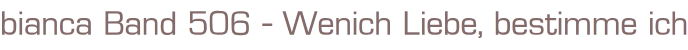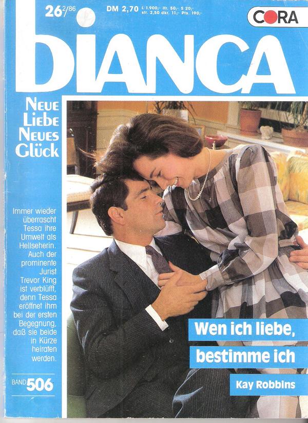 bianca Band 506 - Neue Liebe Neues Glück Titel: Wen ich Liebe, bestimme ich Autor: Kay Robbins Cora Verlag 1986Heft, Softcover, 128 Seiten Format: 13 cm x 18 cmGewicht: 95 gZustand: gut, leichte Gebrauchsspuren