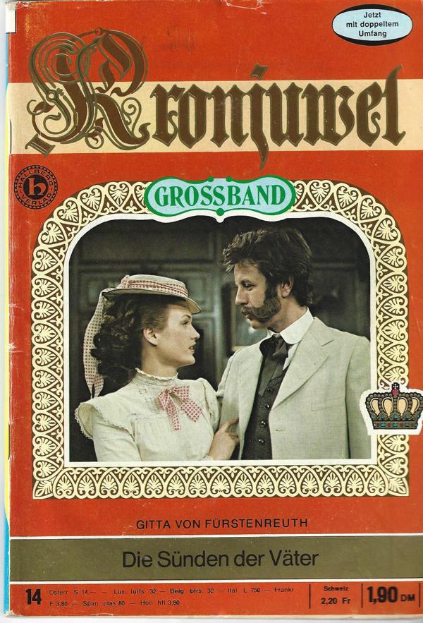 Kronjuwel Nr. 14 GrossbandTitel: Die Sünden der VäterAutor: Gitta von FürstenreuthVerlag: Hallberg VerlagRomanheft, 128 SeitenFormat: 15,5 x 22,5 cmZustand: gut, leichte Gebrauchsspuren