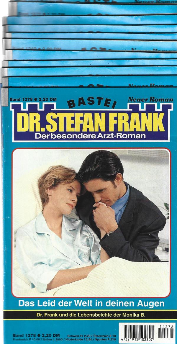 Nr. 1278 Das Leid der Welt in deinen Augen. Nr. 1244 Leben ohne dich? Nr. 1225 Was andere eine Sünde nennen... Nr. 1262 Und zu Hause wartet eine kranke Frau. Nr. 1269 Der Arzt, der ihr Geheimnis kannte. Nr. 1249 Wer zählt die ungewinten Tränen? Nr. 1266 Der Playboy und das Findelkind. Nr. 1273 Ende des Sommers - Ende des Glücks? Nr. 1235 Geh, wenn du die andere liebst. Nr. 1270 Du warst meine erste Liebe, Stefan Frank. Nr. 1275 Dr. Frank und der falsche Engel.