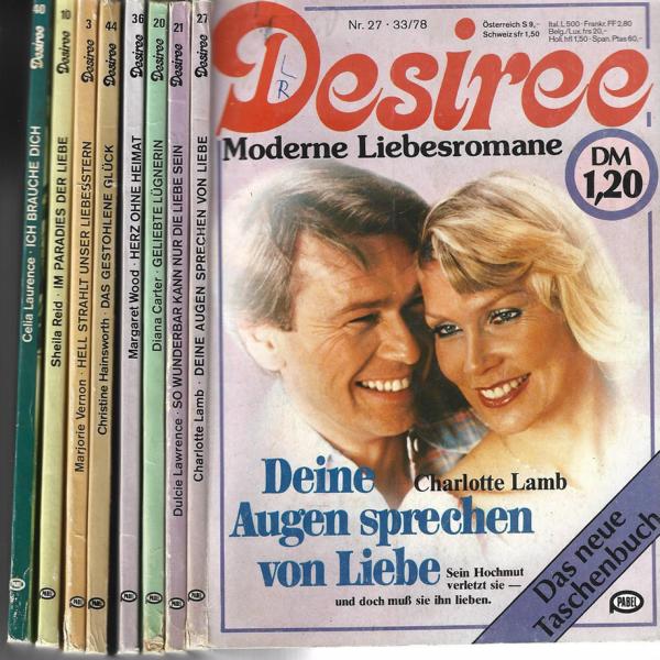 Desiree Moderne LiebesromaneNr. 27,21,20,36,44,3,10 + 40.Verlag: Verlag: Pabel Rastatt 19788Romanhefte á 126 SeitenFormat: 13,5 x 19 x 0,5 cmZustand: leichte Gebrauchsspuren