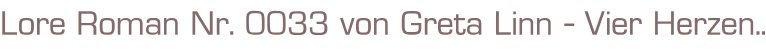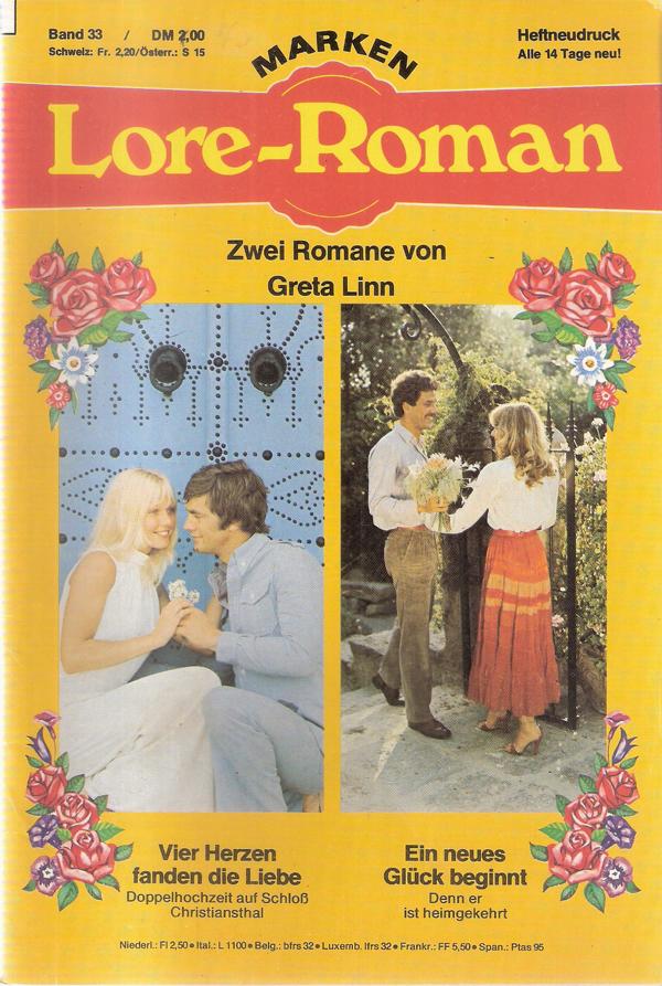 Lore Roman Nr. 33Zwei Romane von Greta LinnTitel: Vier Herzen fanden die Liebe,Ein neues Glück beginntVerlag: Marken Verlag, Romanheft, 96 SeitenFormat: 15 x 20,7 cmGewicht: 50 gZustand: gutLiebesroman
