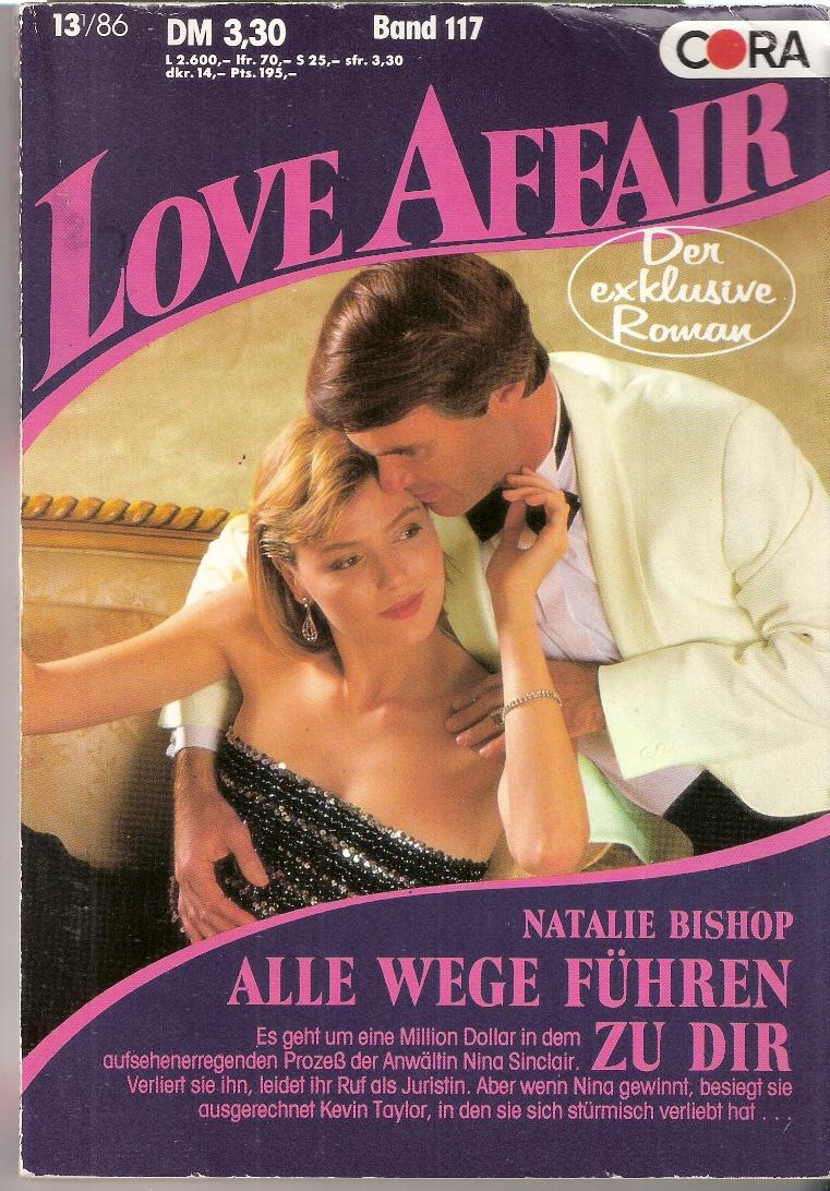 Love Affaire Nr. 117Titel: Alle Wege führen zu dirAutor: Natalie BishopVerlag: CoraTaschenbuch 160 SeitenFormat: 12,5 x 18 x 1 cmGewicht: 108 gZustand: gut