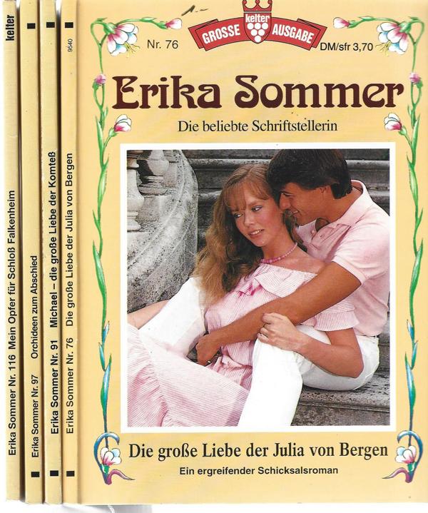 Erika Sommer Nr.76,91,97,116. (4 Stück)große SchriftKelter Verlag Hamburg4 Romne á 128 SeitenFormat: 13 x 18,5 x 3 cmZustand: gut, leichte Gebrauchsspuren