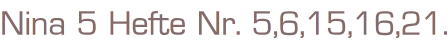 Nina 5 Hefte Nr. 5,6,15,16,21.Kelter Verlag Hamburg5 Romanhefte á 126 SeitenFormat: 13,5 x 19 x 3 cmZustand: gut, leichte Gebrauchsspuren