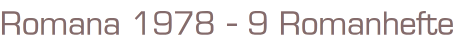 Romana 1977 - 9 RomanhefteNr. 151,152,166,170,182,184,191,234+271.Cora Verlag 197811 Romanhefte á 130 SeitenFormat: 13,5 x 19x 7cmZukunft: gut, leichte Gebrauchsspuren